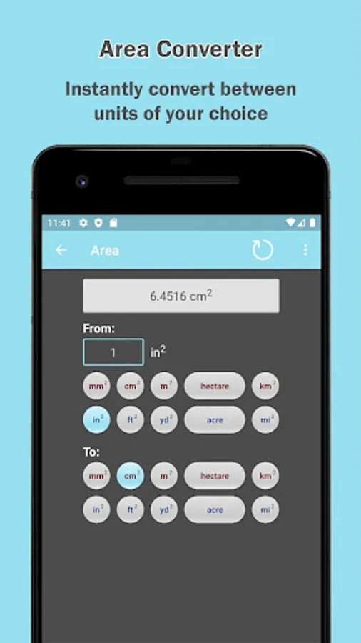 - Area: square mm, square cm, square m, hectare, square km, square inch, square foot, square yard, acre, square mile
