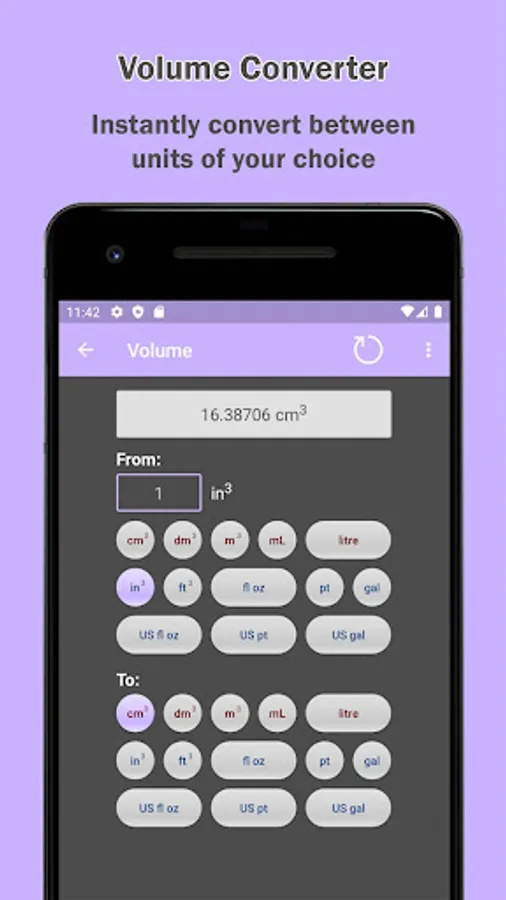- Volume: cubic cm, cubic dm, cubic m, millilitre, litre, cubic inch, cubic foot, fluid ounce, pint, gallon, US fluid ounce, US pint, US gallon