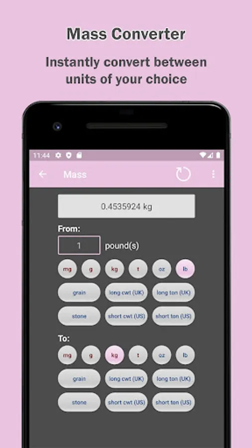 - Mass: mg, g, kg, tonne, ounce, pound, grain, stone, long cwt (UK), long ton (UK), short cwt (US), short ton (US)