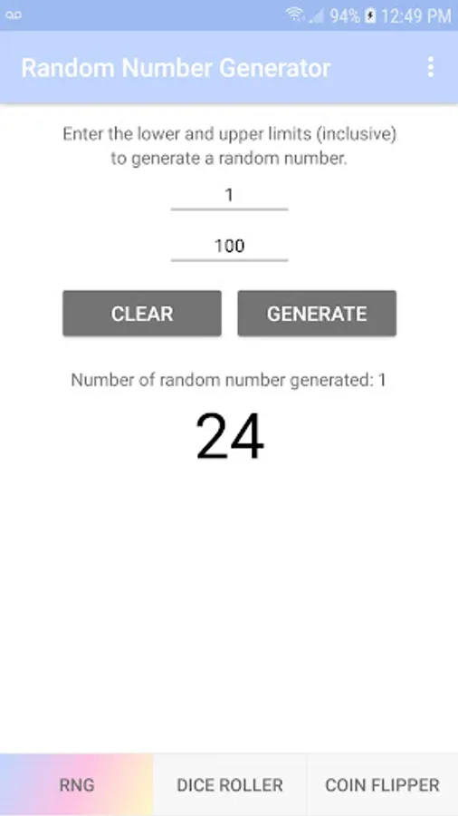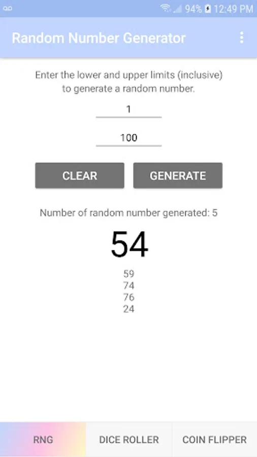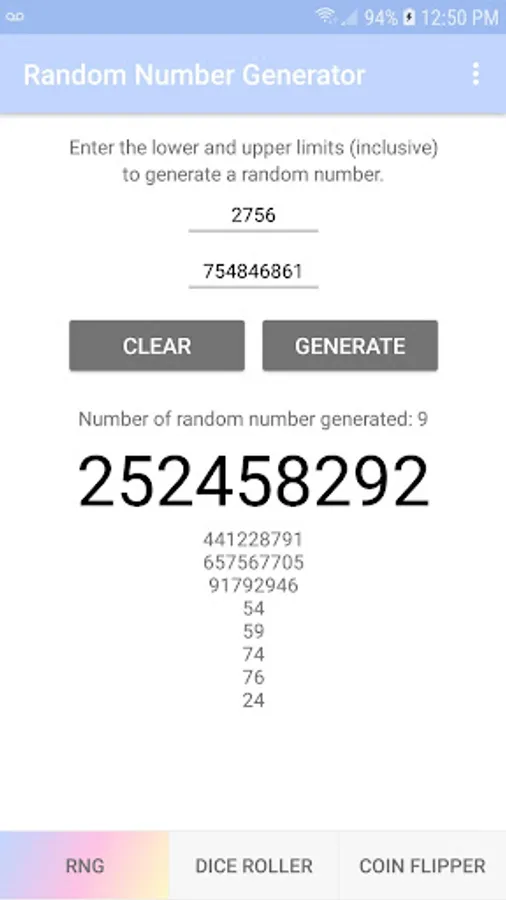 RNG is a free app that generates a random number between the two numbers of your choice. Plus, there are virtual simulators for the dice roller with 1, 2 or 3 dice and the coin flipper. The simple interface allows you to easily and quickly use the app with a simple click.