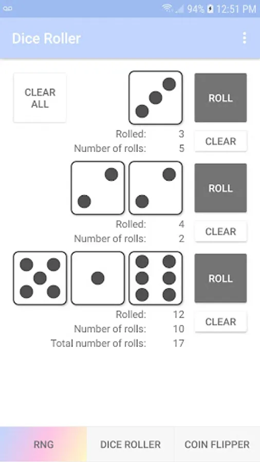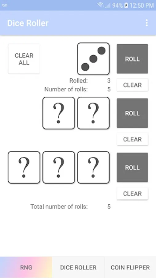 - dice roller with 1, 2 or 3 dice and shows number of rolls