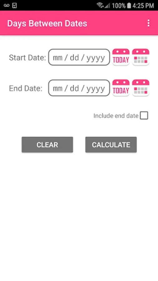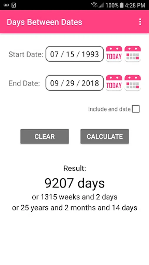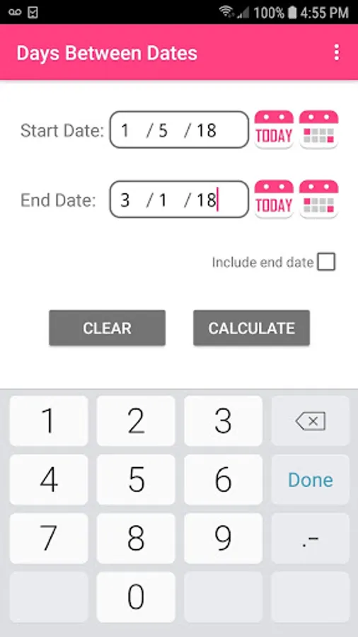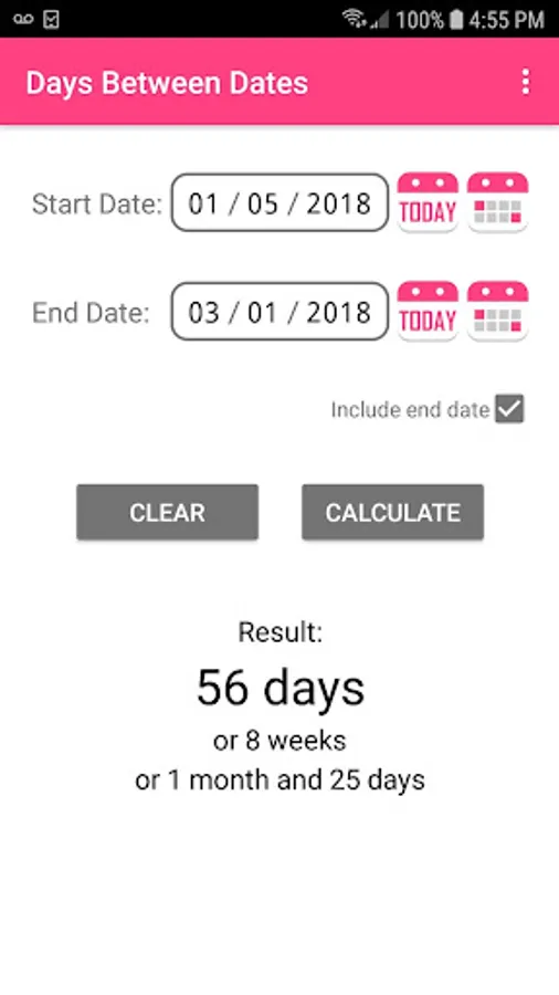Days Between Dates calculates the number of days between the two dates you choose, which can be entered manually or selected from the calendar or selected with the today button. Also, the simple interface allows you to easily and quickly use the app.