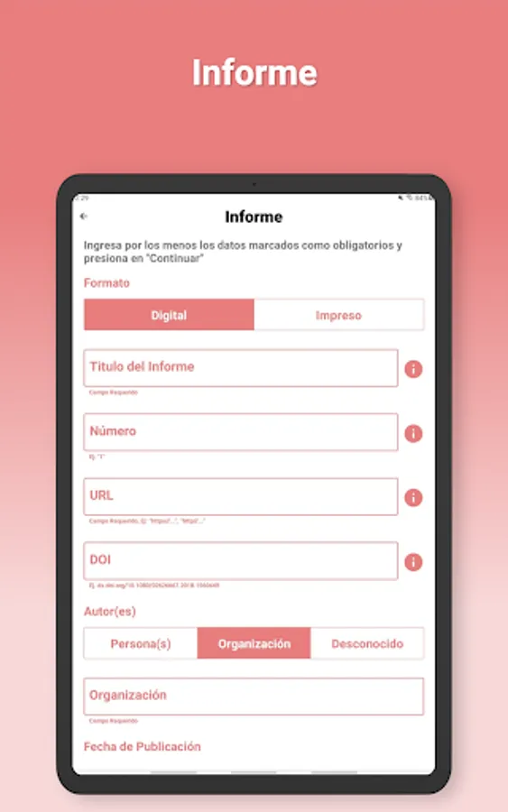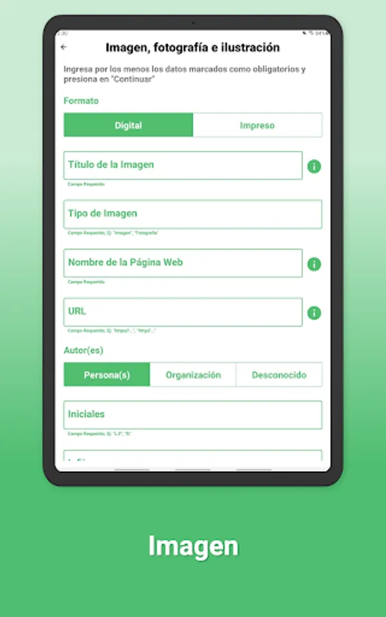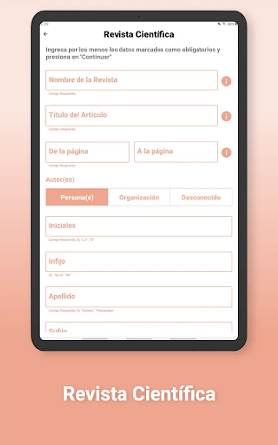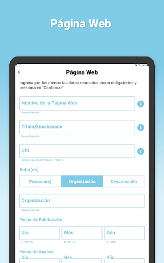 With APPA you will be able to make citations and bibliographical references in APA 7th edition format for your school work, theses, scientific research, etc., you just have to fill out a small form with the data of the source you want to cite and touch the continue button.
