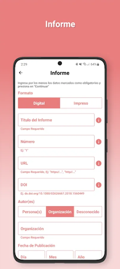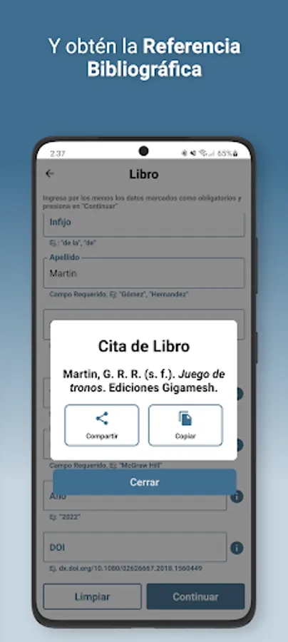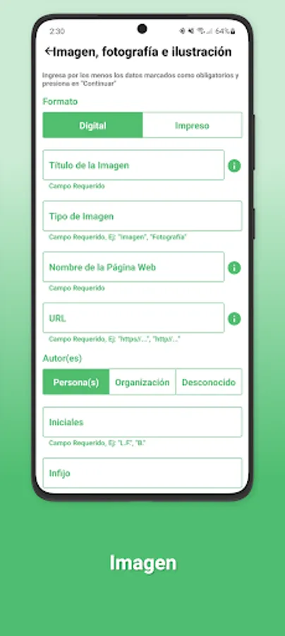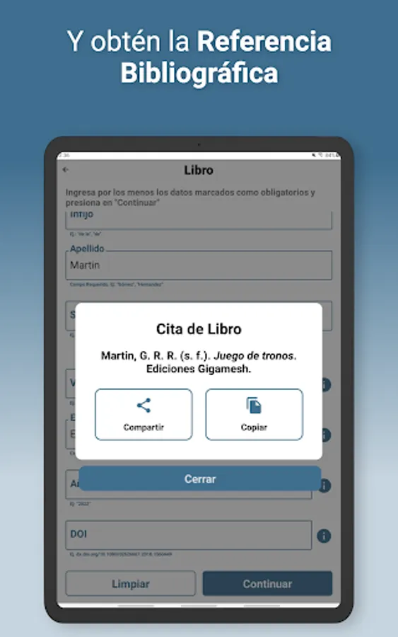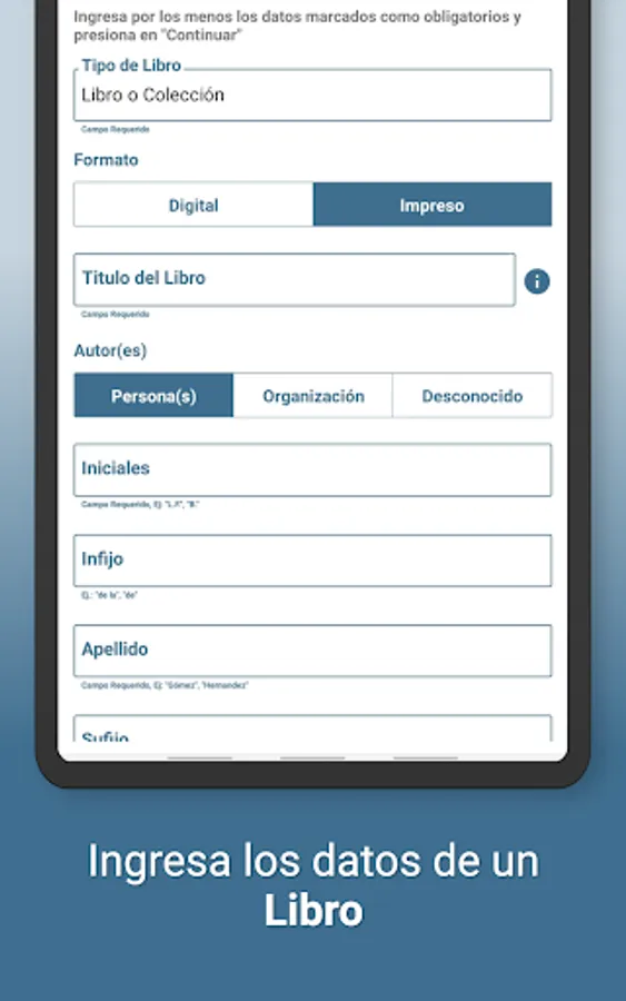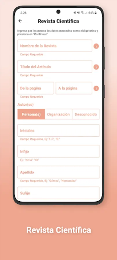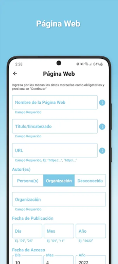 With APPA Pro you will be able to make citations and bibliographical references in APA 7th edition format for your school work, theses, scientific research, etc., you just have to fill out a small form with the data of the source you want to cite and touch the continue button.