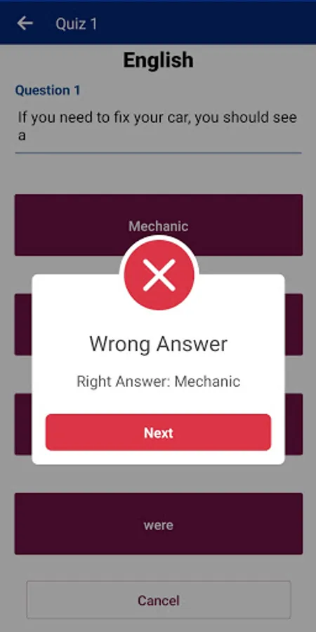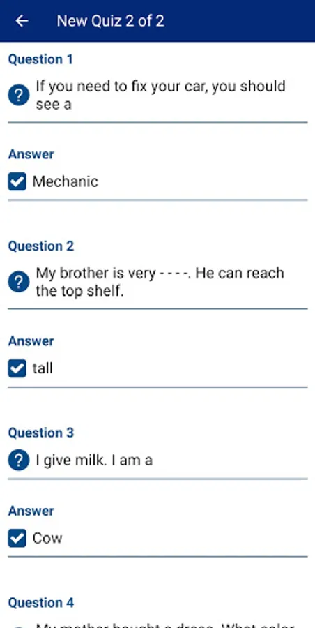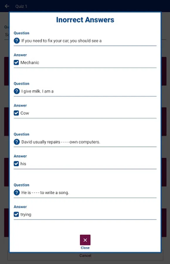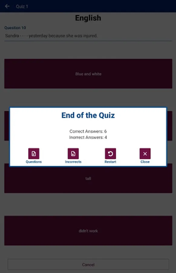 When you finish answering the quiz, you will be shown how many correct and incorrect answers you had, you will also be able to see all the questions its the quiz, see the questions in which you made a mistake along with their correct answer, try again or return to the main menu.