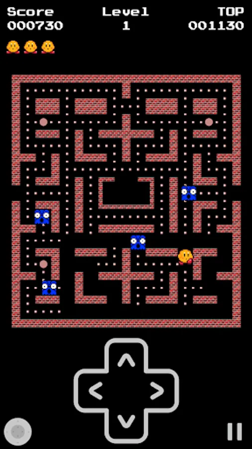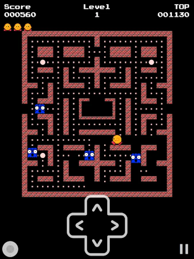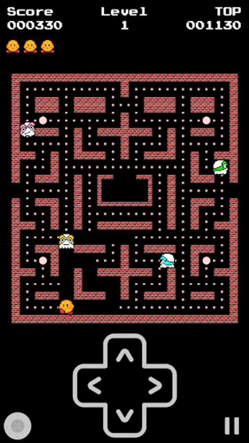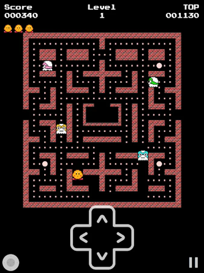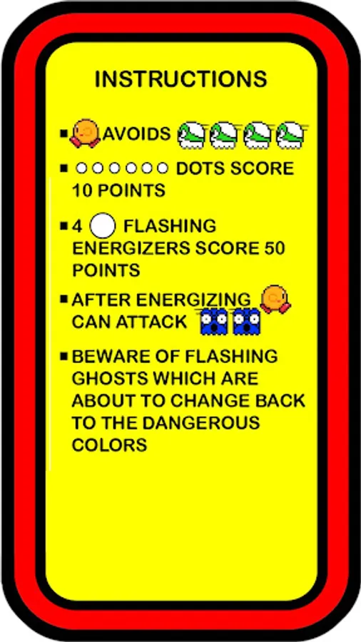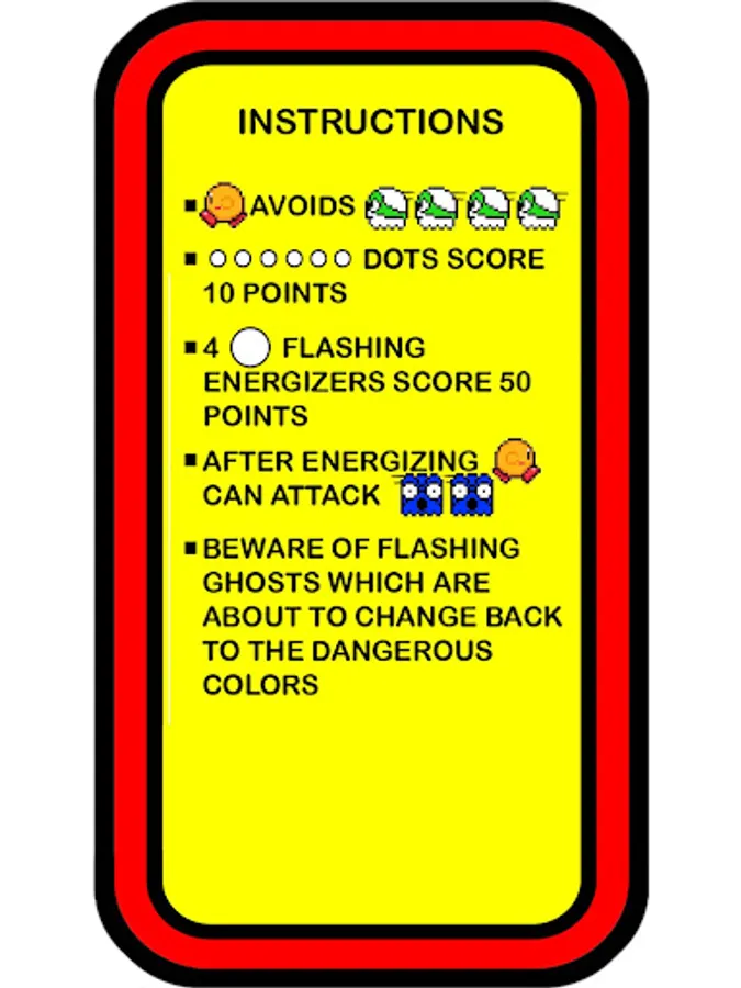 The player navigates the main character through a maze containing various dots, and four multi-colored ghosts. The goal of the game is to accumulate points by eating all the dots in the maze, completing that 'level' of the game and starting the next level and maze of dots. The four ghosts roam the maze, trying to kill main character. If any of the ghosts hit main character, he loses a life; when all lives have been lost, the game is over.