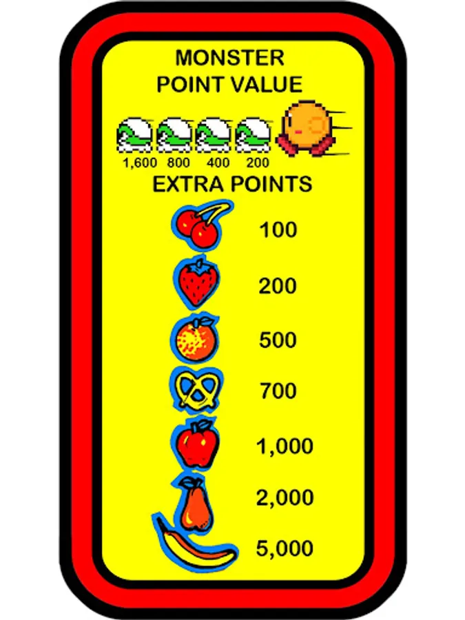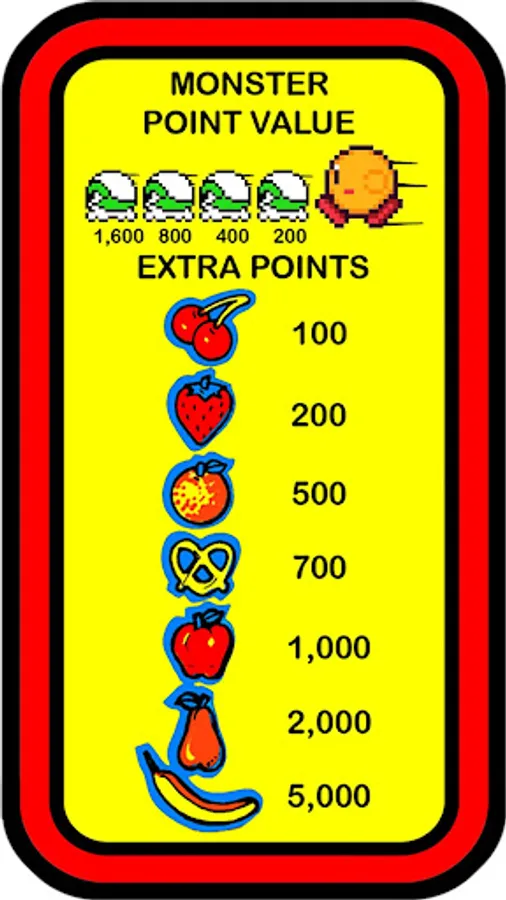 There are also fruits, located directly below the center box, that appear twice per level; eating one of them results in bonus points (100-5,000).