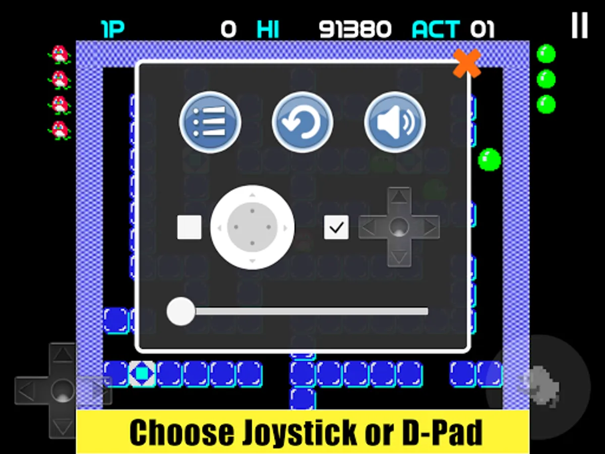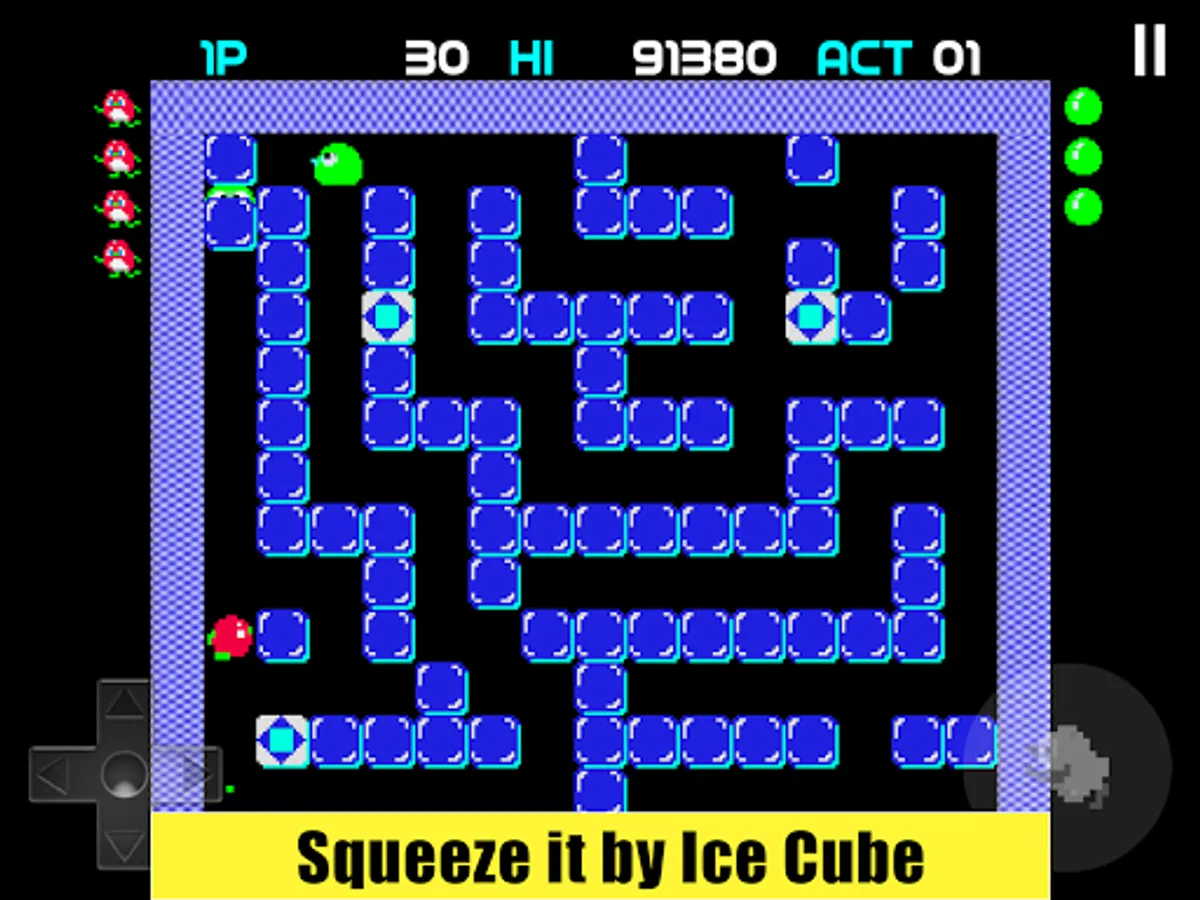 The player control Pengo, a penguin character. Tap the button while pushing the joystick against an ice cube will cause it to slide in that direction until it hits another ice cube or a wall if space directly ahead of it is unoccupied by an ice cube or wall. If that space is occupied, pressing the button will crush the ice cube instead.
