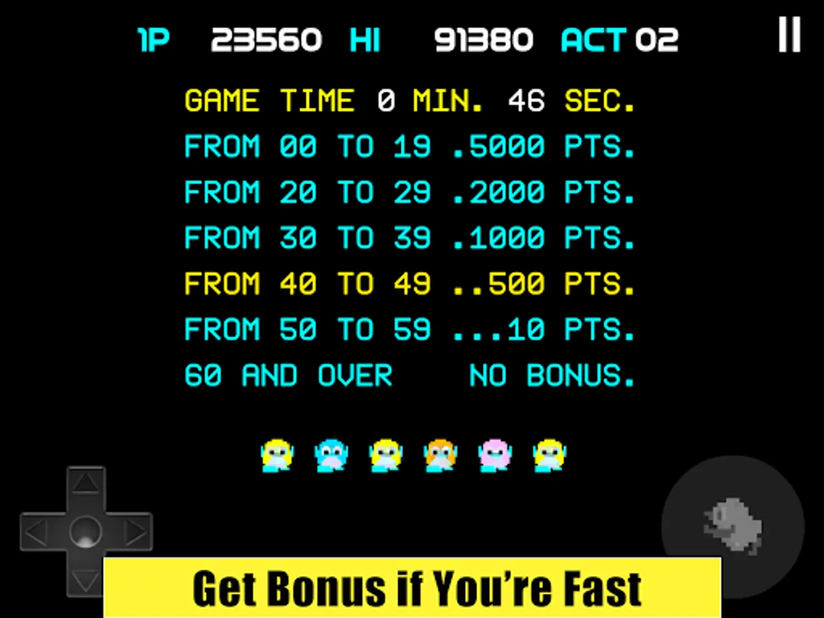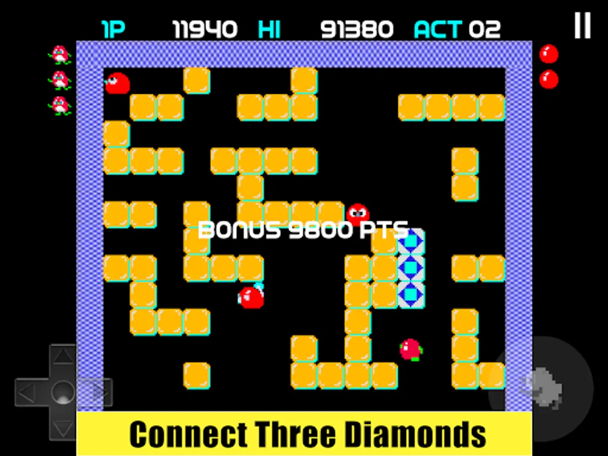 Three diamond cubes in each round are marked with diamonds and cannot be crushed. Arranging these blocks in a continuous horizontal or vertical line awards 10000 bonus points and temporarily stuns every active Sno-Bee. If the player eliminates every Sno-Bee in less than 60 seconds, bonus points are awarded based on the time taken. The player will add one more life every 50000 points.