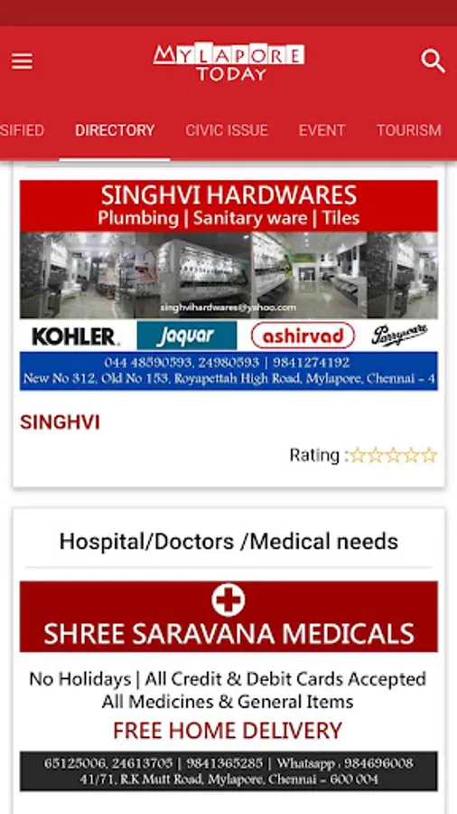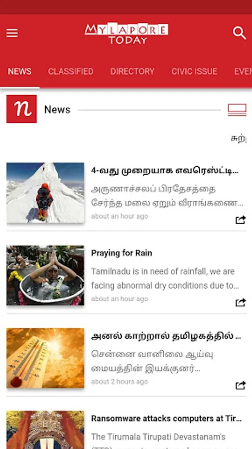 Mylapore Today Android App gives you important breaking news across Tamilnadu, focus mainly on the local news, civic issues and events happening in Mylapore and its suburbs.Tourist attractions and interesting places to visit in Chennai is also an Addon feature of the App.