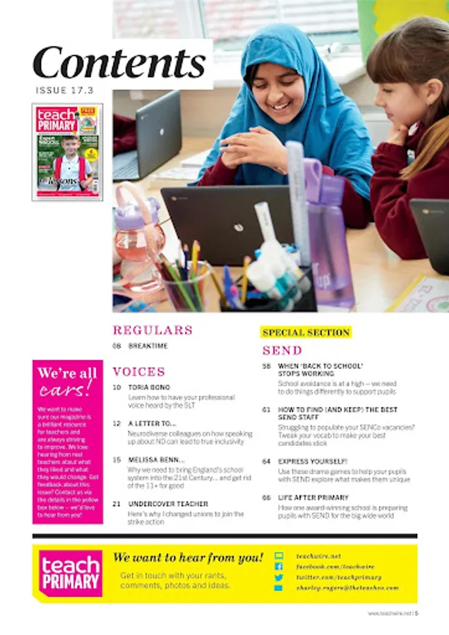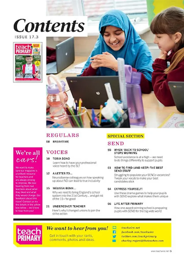 Teach Primary magazine helps you to develop outstanding teaching skills. Written by leading experts in education, it offers new and effective ideas on delivering English, Maths and the broader curriculum for 5-11-year-olds. Each issue includes:
