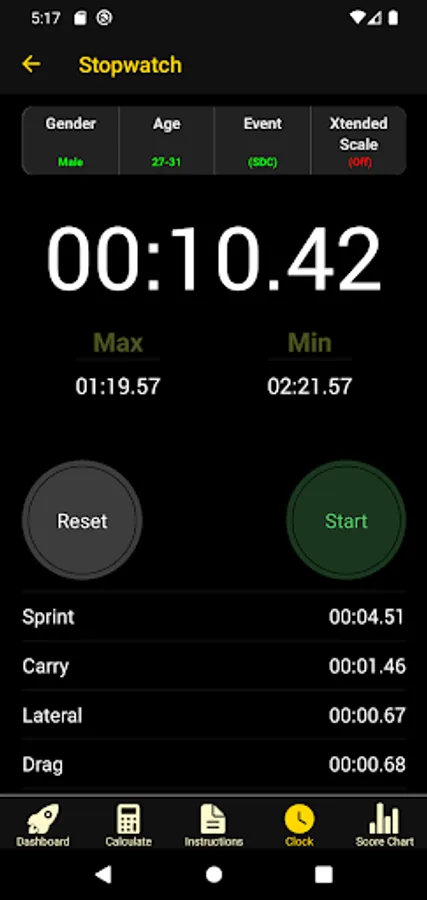 • Stopwatch that counts down the time for each Physical Demand Category for the Sprint Drag Carry and Two Mile Run