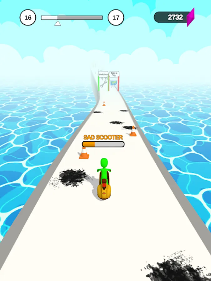 Get to the end of the road collecting all money, wheels and wrenches to improve your vehicles.