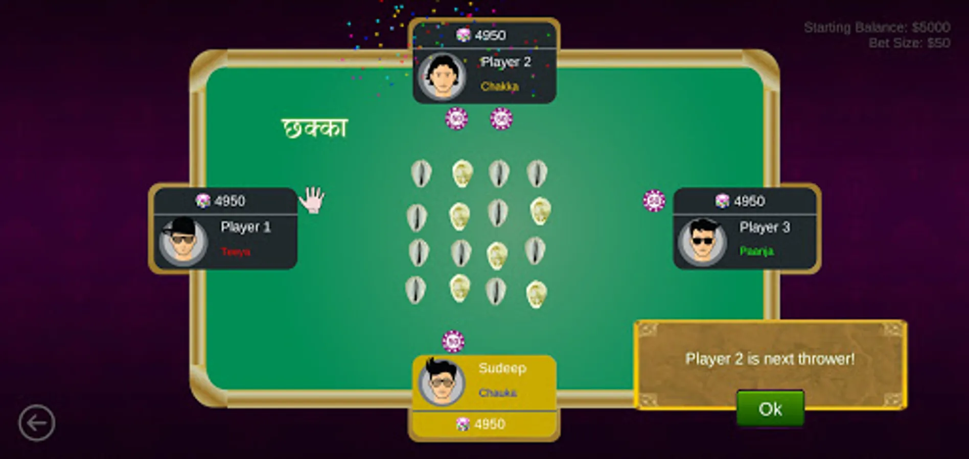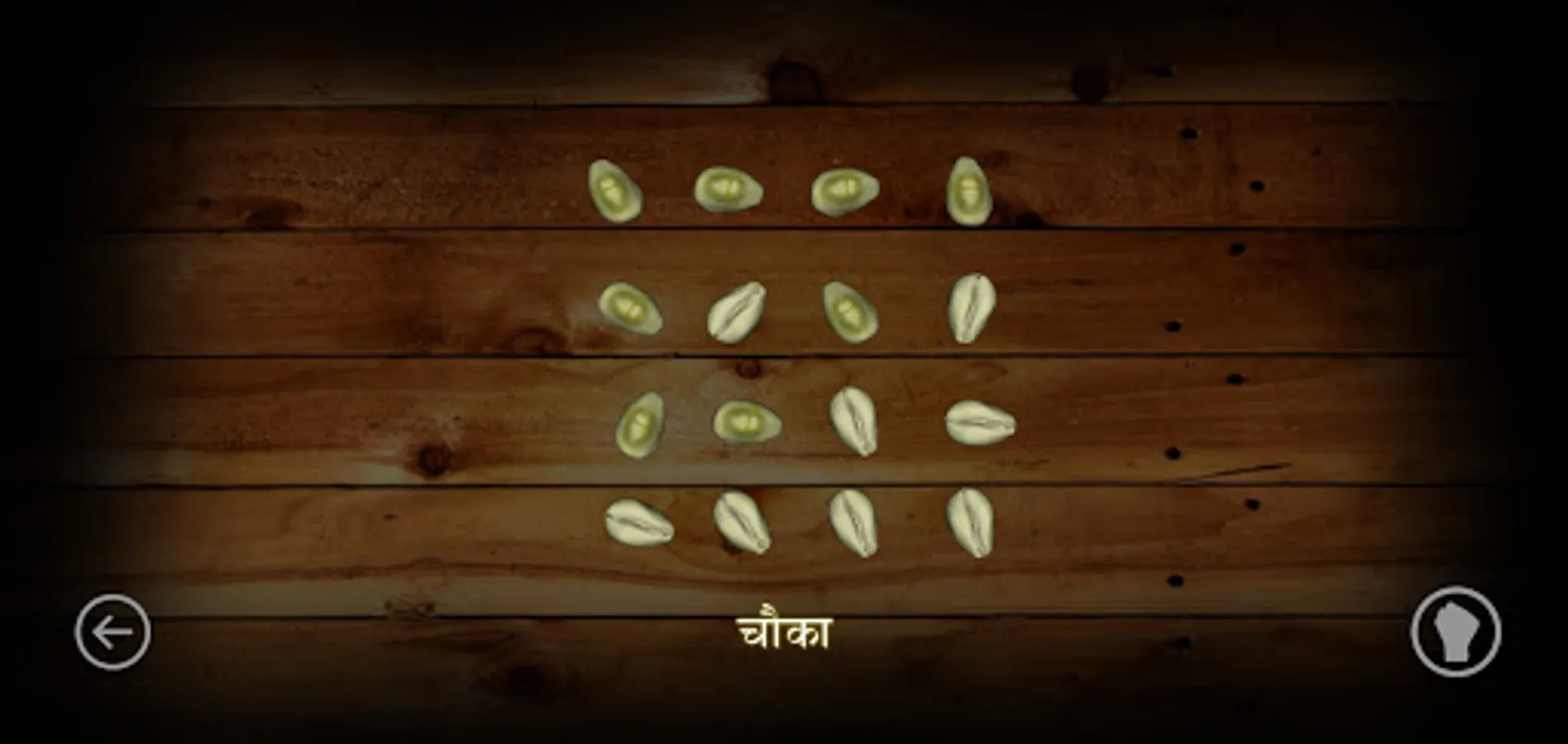It is played with 16 shell and the back side or front side determines win and loose. The front side occurrence is called "ghopte" and the backside occurrence is called "kolte" In a single game, four players play the game.