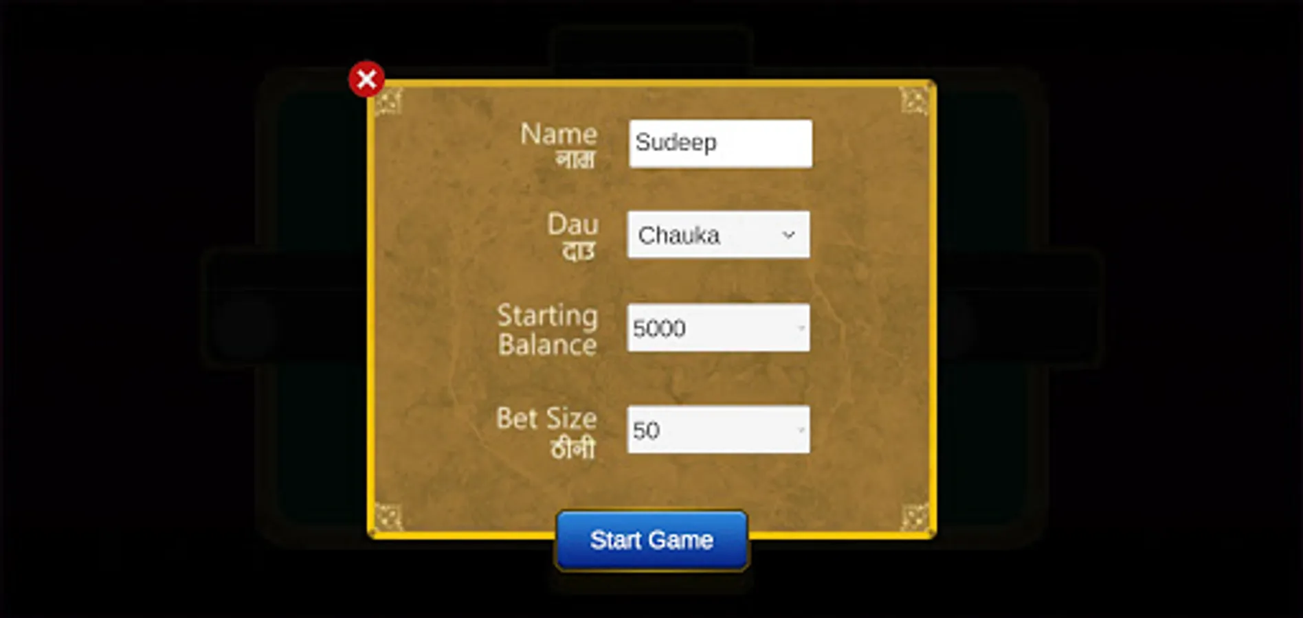 Before starting the game 4 player takes dau "teeya", "chauka", "paanja" and "chakka" (तीया, चौका, पंजा, छक्का) facing opposite to each other in anti-clock wise direction. First of all "teeya" starts the game which is also known as "haate" (हाते, a thrower).