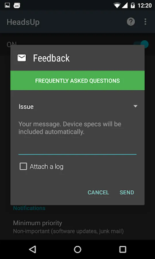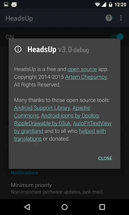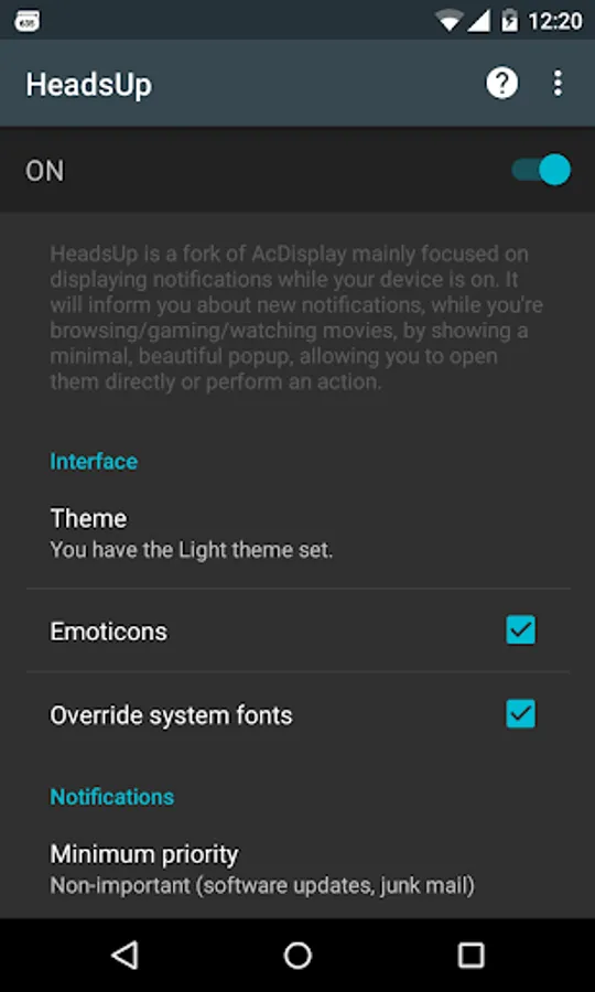 HeadsUp is a fork of AcDisplay mainly focused on displaying notifications while your device is on. It will inform you about new notifications, while you're browsing/gaming/watching movies, by showing a minimal, beautiful popup, allowing you to open them directly or perform an action.