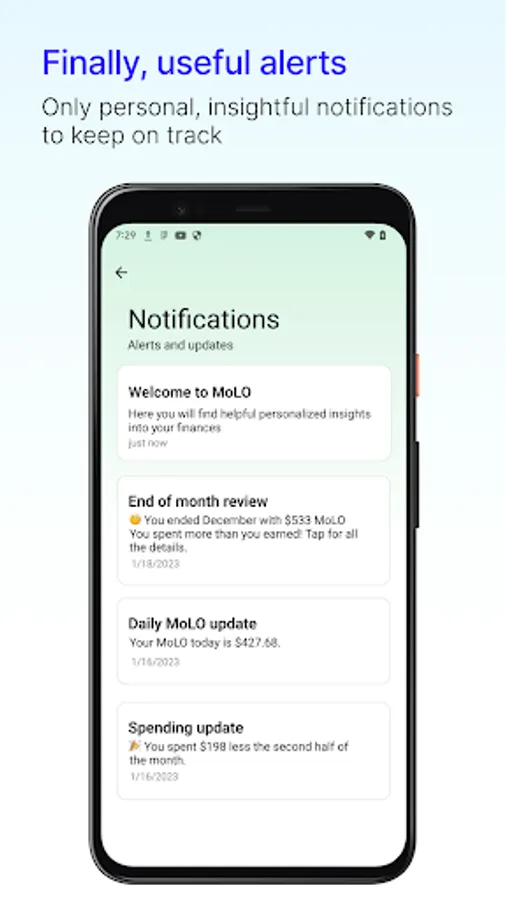 Get custom, insightful notifications for potential fraud, spending and expense updates, or monthly reviews of past months’ finances.