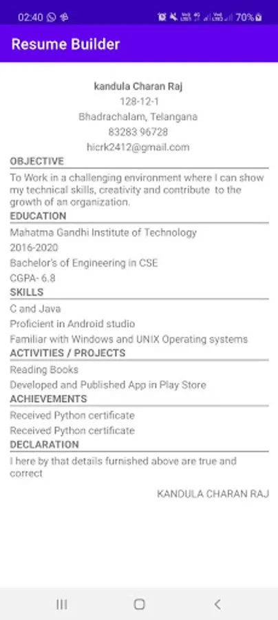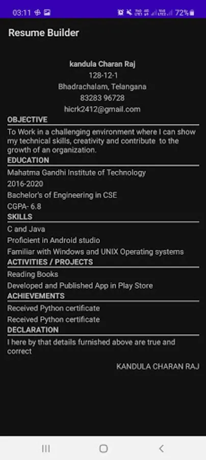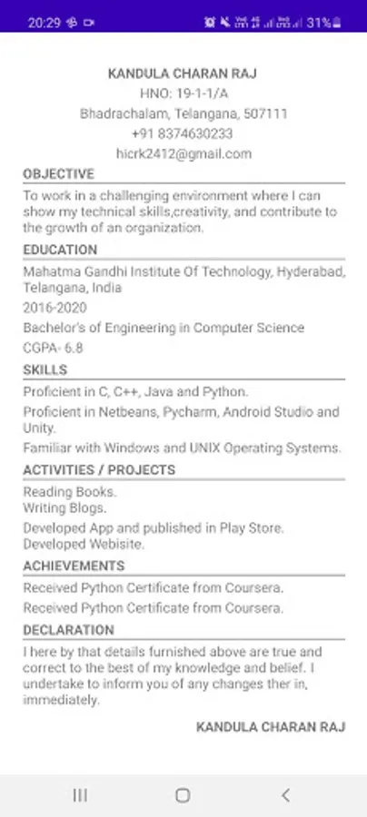 When I was a fresher I don't know very much English and unable to build my Resume and after getting experience in my study fields. I have much interest in developing apps. For building my resume I have referred to so many websites and unable to find the proper data. My resume looks like a bot and I have knowledge in building Apps now, I have developed the Resume Builder App in 6hours and uploaded it to the play store. Without any large machine, Now we can build a Single Page Resume Easily.