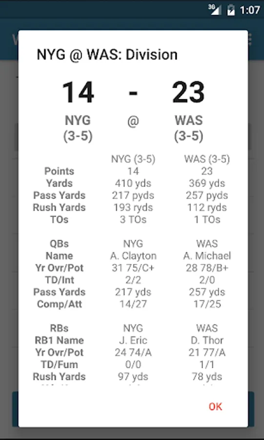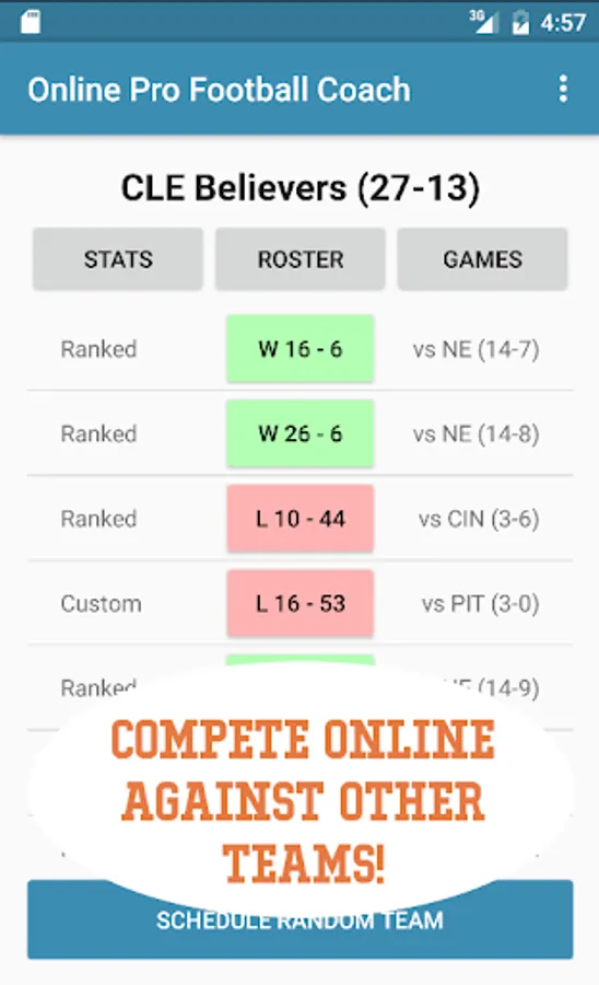 Your team will play 16 games in the regular season, just like real professional football leagues. By navigating to the "GAMES" tab, you can see exactly what your team's schedule is. And by clicking on each game, you can see a scouting report of the two teams (if the game has yet to be played), or a summary of the game (if it was already played).