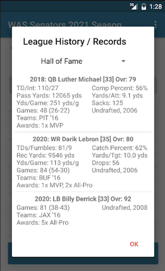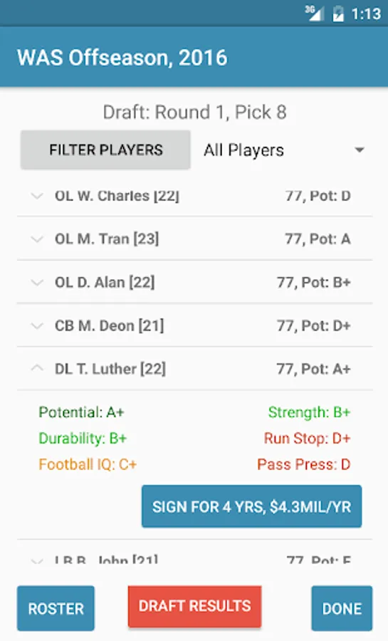When you first inherit a team, you will have a total of 46 players (22 starters) on your roster. When you first inherit a team, you will have at least 46 players (22 starters) on your roster. Each player has a name, their age, an Overall rating, Potential rating, Durability rating, Football IQ rating, and three position specific ratings. The Overall rating is just a composite rating of the three position specific ones, while Potential determines how much each player improves during the offseason. Durability determines how likely a player is to be injured, and Football IQ is a measure of how football smart the player is. Smarter teams perform better on the field, and Quarterbacks and Safeties especially benefit from a higher Football IQ. Each player also has a contract, which is determined by their position and how good they are.You can view all of these players in the "ROSTER" tab, which will include:
