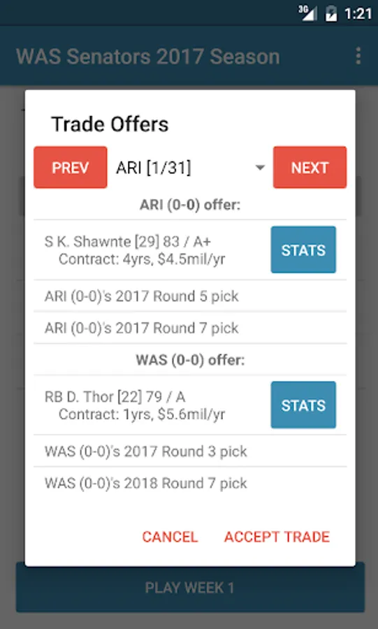 In Pro Football Coach, teams can trade with one another just like real life professional football leagues. If you wish to trade some of your players or picks, add them to the trading block by clicking "TRADE" or holding down on their name. Then click "View Offers" on the trade tab to see what offers the other 31 teams in the league will give for your trade pieces. If you wish to trade for a particular player or draft pick from another team, then go to that teams roster and add the player/pick to their trading block. Then click "View Offers" to see what the team wants from you for the players or picks you added. Contracts are not taken into account during trading for simplicity, but taking on big contracts may prevent you from signing more free agents in the offseason.