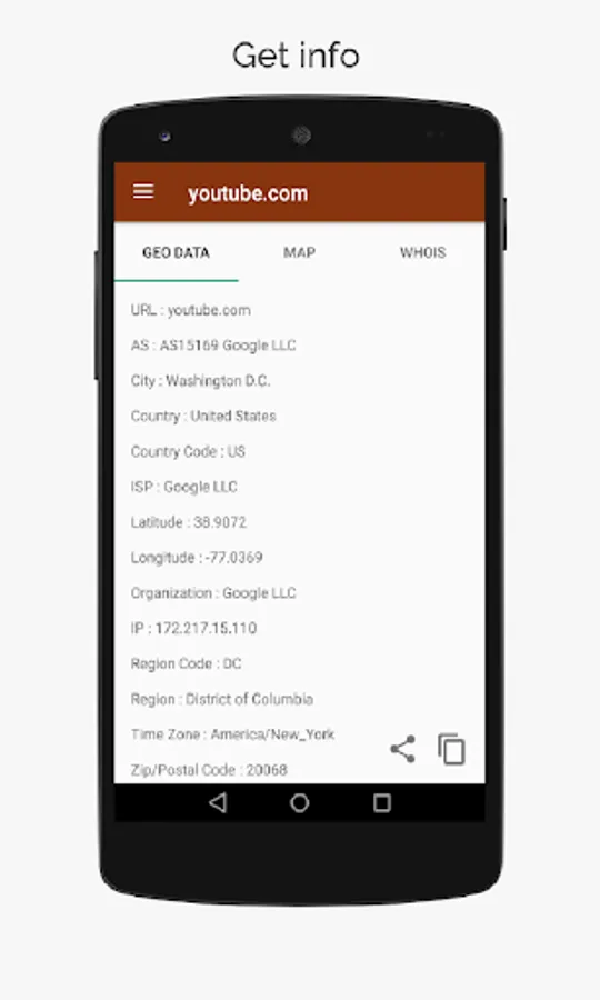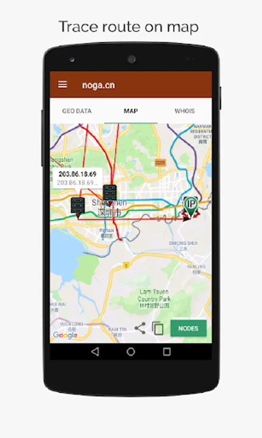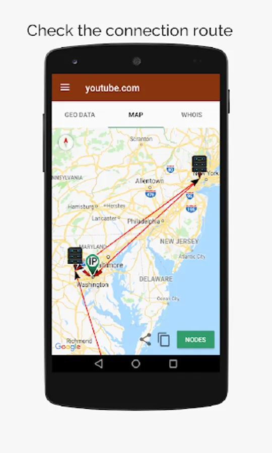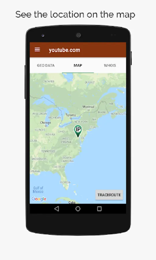 -> See on the map the route of the connection from your device to the location of the searched IP / URL (Traceroute function)