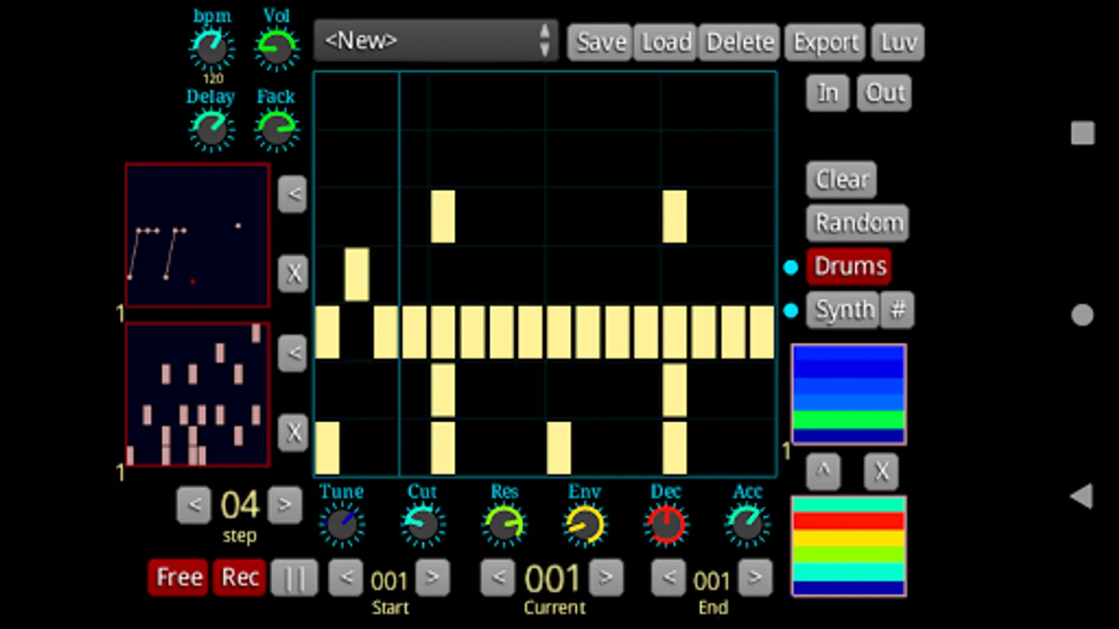 Draw in notes, adjust the sound parameters with knobs, auto create random patterns.