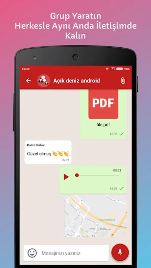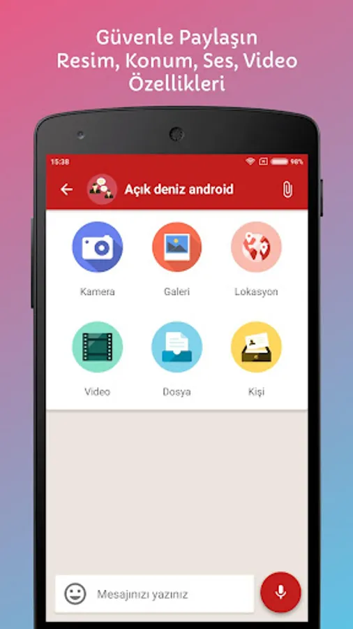 Photos, videos, sounds, location (instant location, place and live sharing), contacts can be shared with users. Also all document types (word, excel, pdf etc...) that are allowed by administrators can ben shared.
