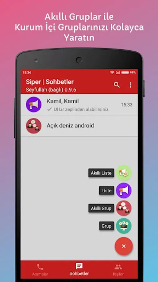Besides making static groups by selecting group members one by one, Siper has smart groups that can be formed by teams and departments of an enterprise. Also by filtering users smart groups and broadcast lists can be created. Backend services control these smart groups. If you created a static group yourself, you can control your group. If a group is smart, backend system controls it for you.