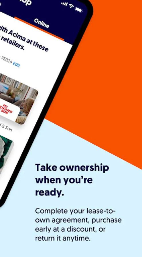 You can then use the Acima mobile app to easily check out with your approved retailer or to switch locations if you change your mind and would like to shop somewhere else.