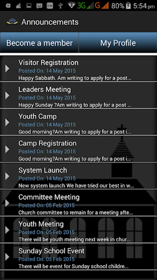 ACK church members mobile application.Allow church members to access church activity in real time for example announcements, church meetings and events, video sermons, post prayer requests etc.