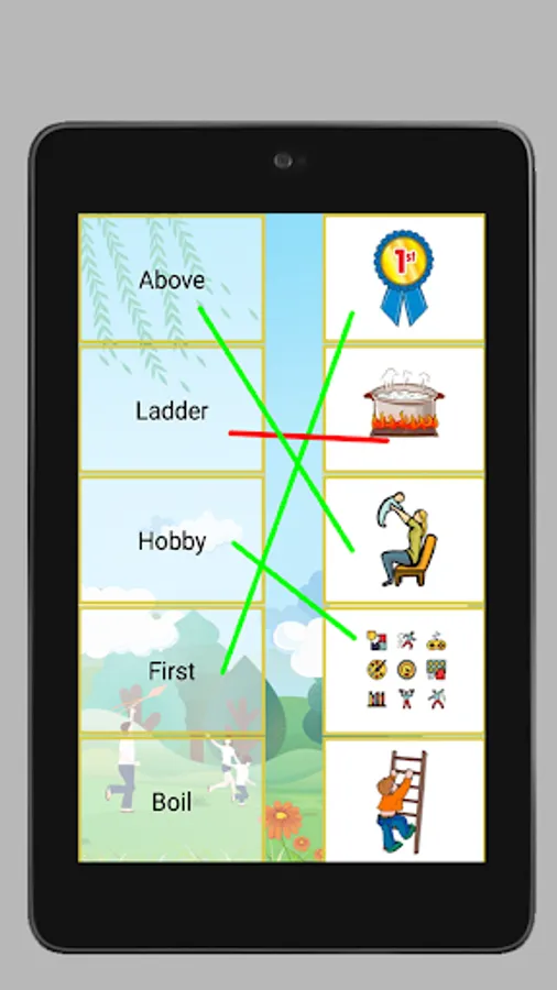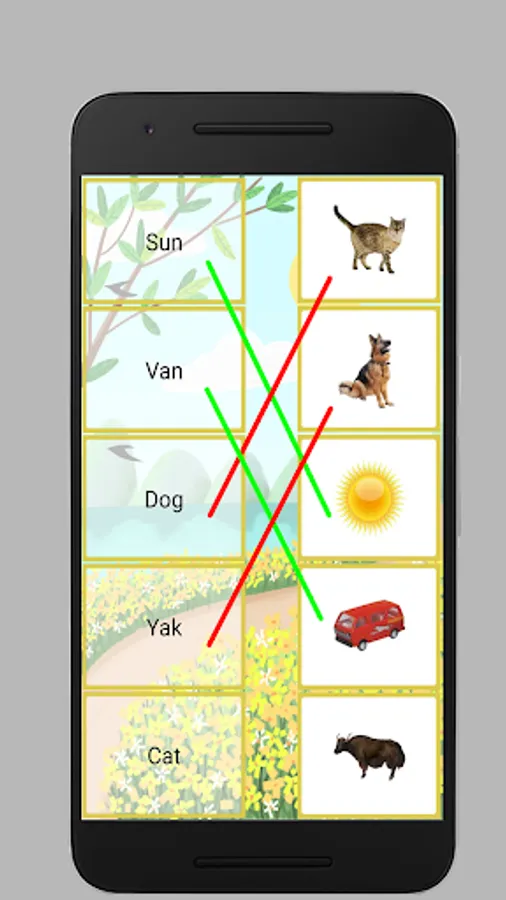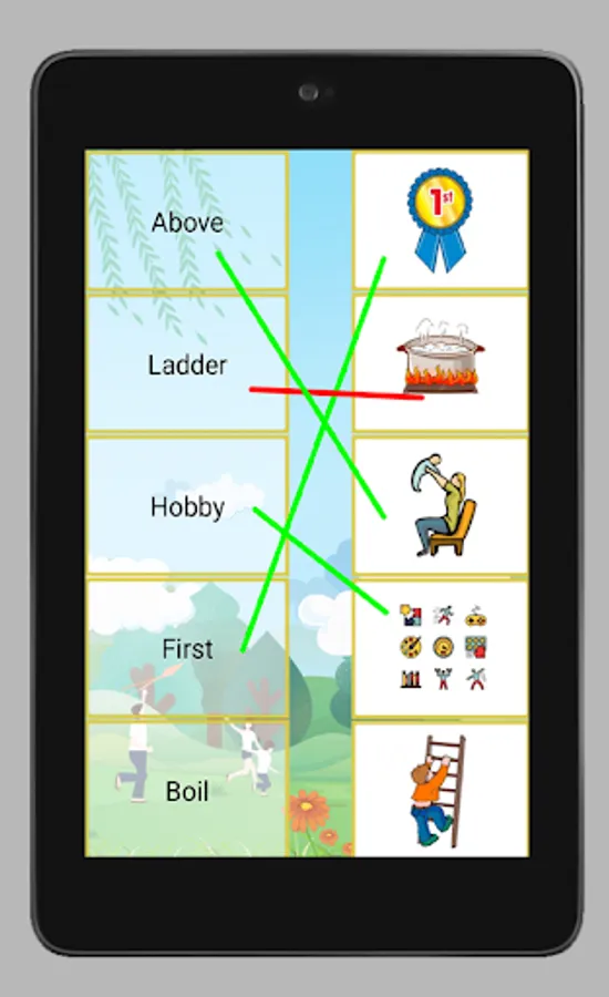 With an impressive collection of 270 levels, each increasing in difficulty and variety, you'll find yourself constantly challenged and motivated to progress. In each level, you'll be presented with a set of five pictures and five corresponding words. Your task is to connect the correct word to its matching picture by dragging your finger across the screen. When you successfully make the right match, a delightful green line will connect them, and you'll feel a sense of accomplishment. On the other hand, if you make an incorrect match, a red line will appear, accompanied by a buzzer sound, indicating that you need to try again.