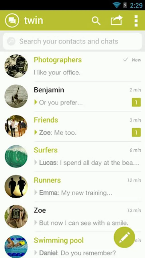 In addition to sending international free sms to any of your contacts with twin you can send photos, videos, music and all kinds of media files to other users up to 10 Gb!