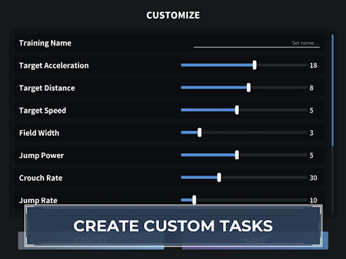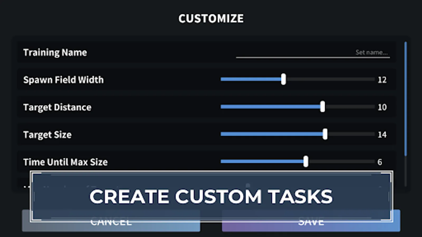 There are over 30 training tasks to choose from, which will all help you practice different areas of your aiming skill. All of the tasks are highly customizable - from the size and position of the target to the game speed.