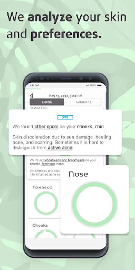 We detect active acne and provide you with insights on how to treat it based on facial region. We also let you measure your skin ‘score’ by region to help you target specific areas.