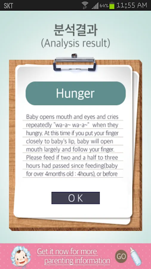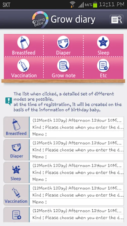 After recording the cry of the baby , it is possible to not only analytical functions to cry in the app that will analyze the cause of the crying and share a variety of information necessary to parenting and pregnancy / childbirth / child care / hang out / anonymous bulletin board the child care helper function with the community , there is a function of child care notebook that can be managed in the album were recorded growth diary of us to manage nursing amount of breast-feeding patterns of the baby , sleep patterns , and excretion , the growth process of day-to-day .