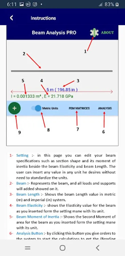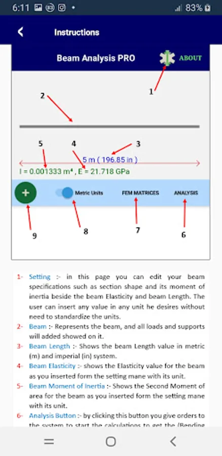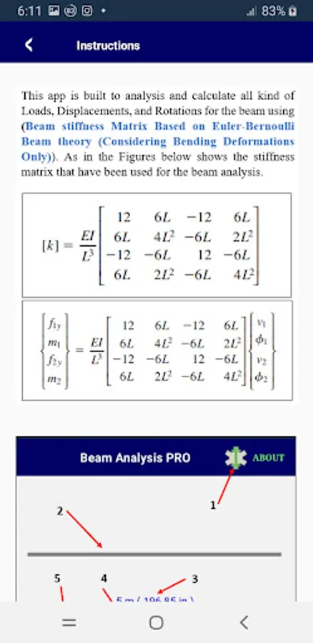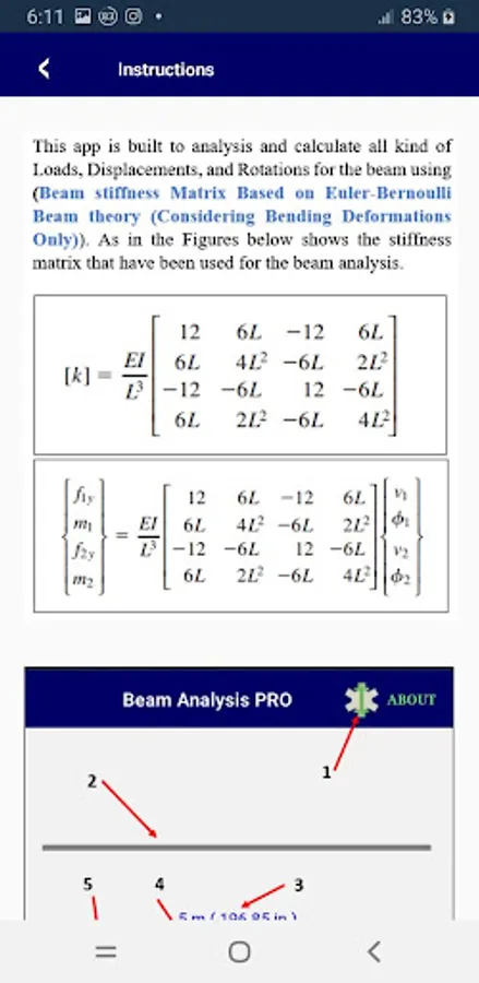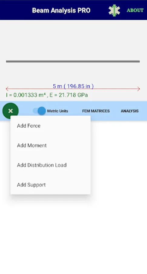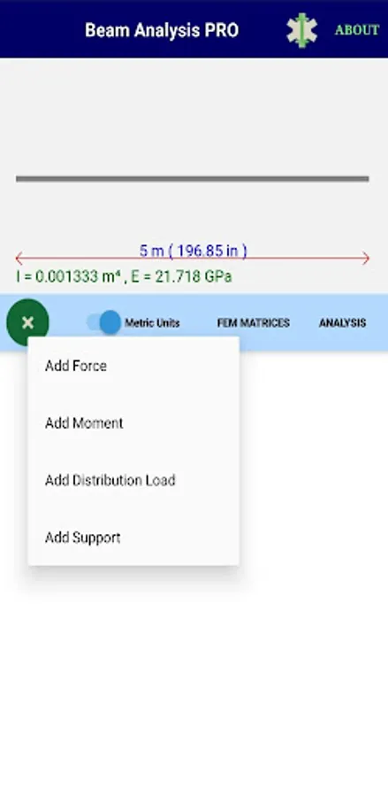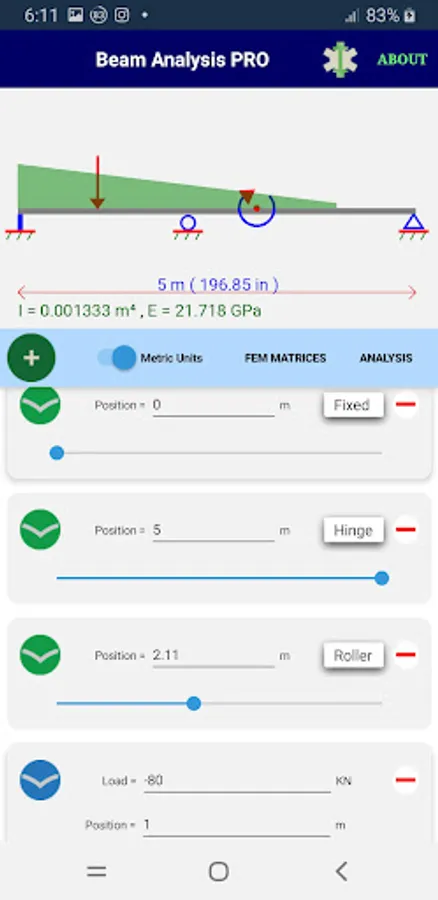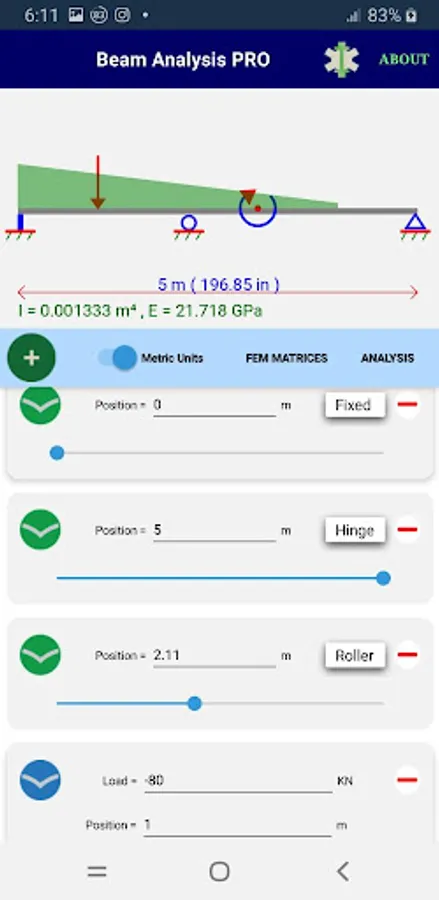 This app uses finite element method to analyze a beam. The app provides 6 of each one of concentrated load, moment, and distributed load, beside 4 supports. The app provides easy control for beam and it's loads. The app also allows the user to insert beam properties such as it's shape, elasticity, and moment of inertia.