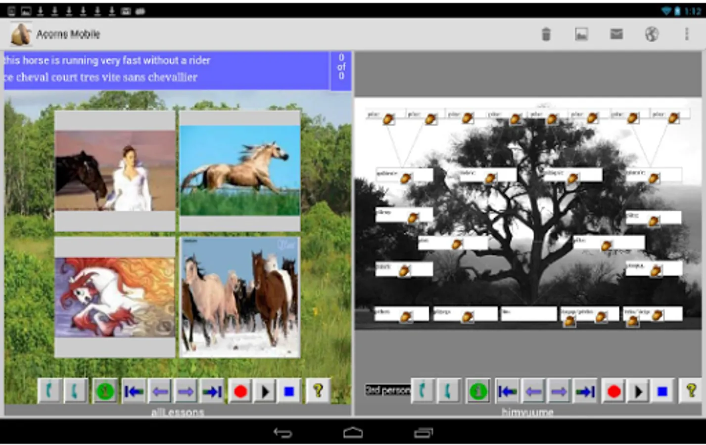 ACORNS desktop software (freely downloadable from http://cs.sou.edu/~harveyd/acorns) allows language instructors and students easily to prepare and execute language learning lessons. The ACORNS mobile player maintains a gallery of these lessons and executes them on Android compatible devices. Once the ACORNS mobile player application is installed, it launches when it receives an ACORNS lesson by email attachment, through a cloud-based service (i.e. Drop Box), or through a Web download link address. ACORNS lesson files have an .acorns extension,