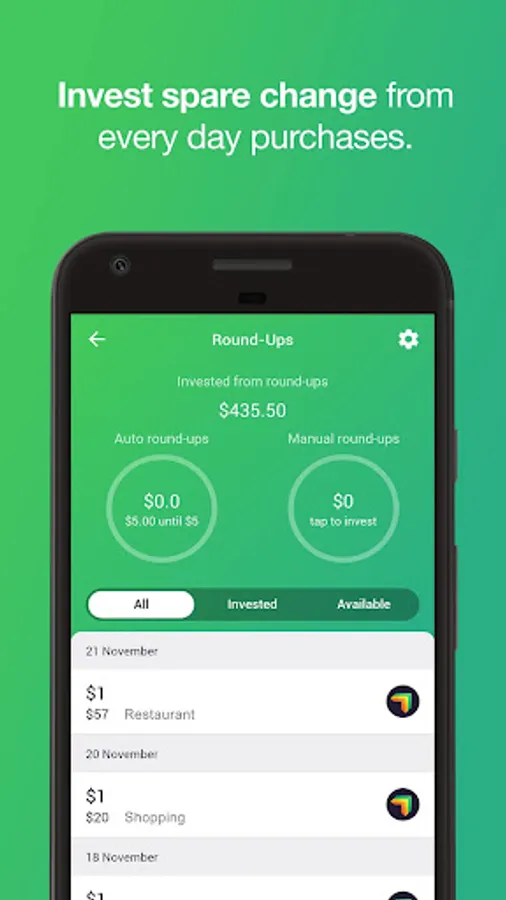 Our flagship feature. Automatically round-up the spare change from your everyday purchases and invest it into a diversified portfolio of stocks and bonds. Invest in the background of life