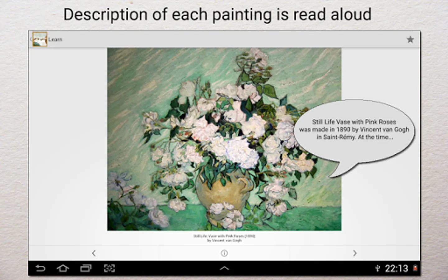 Find work of DaVinci, VanGogh, Klimt, Bosch, Degas, Michel Angelo, Malczewski and of many more. While browsing through the art gallery, listen to description of the masterpieces, put them on your wallpaper or start rotation to get a new wallpaper every day.