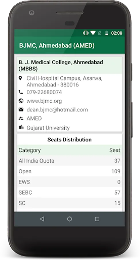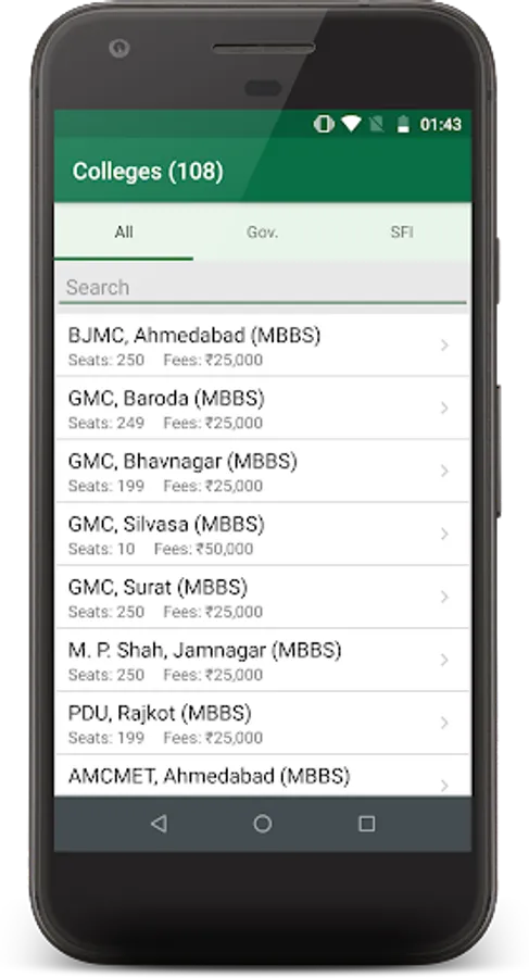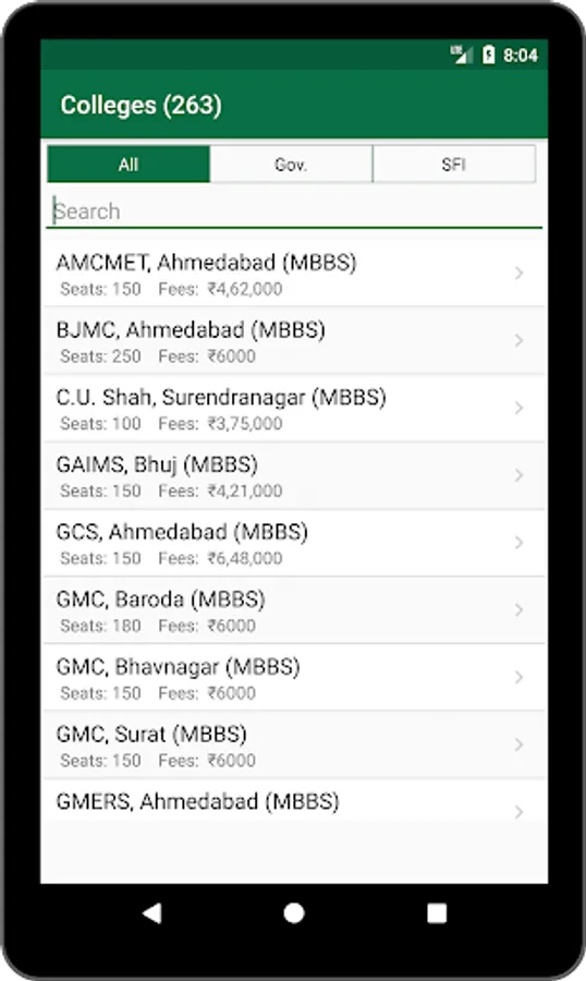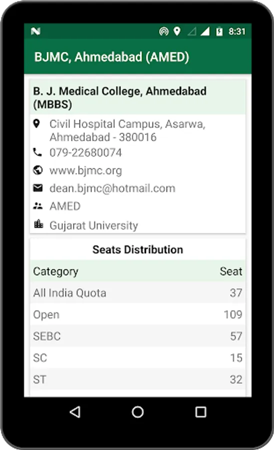 » College - The app shows detail data of 100 Medical and 187 Paramedical colleges including Govt., GMERS (Semi Govt.) and SFI colleges. College address, contact number, website, email address, fees per year of Govt. Quota, Management Quota, and NRI Quota, total intake, cutoff based on admission 2021. Closing as per Mock Round 2021 is shown for OPEN, SEBC, SC and SC categories.