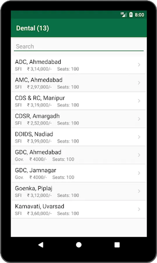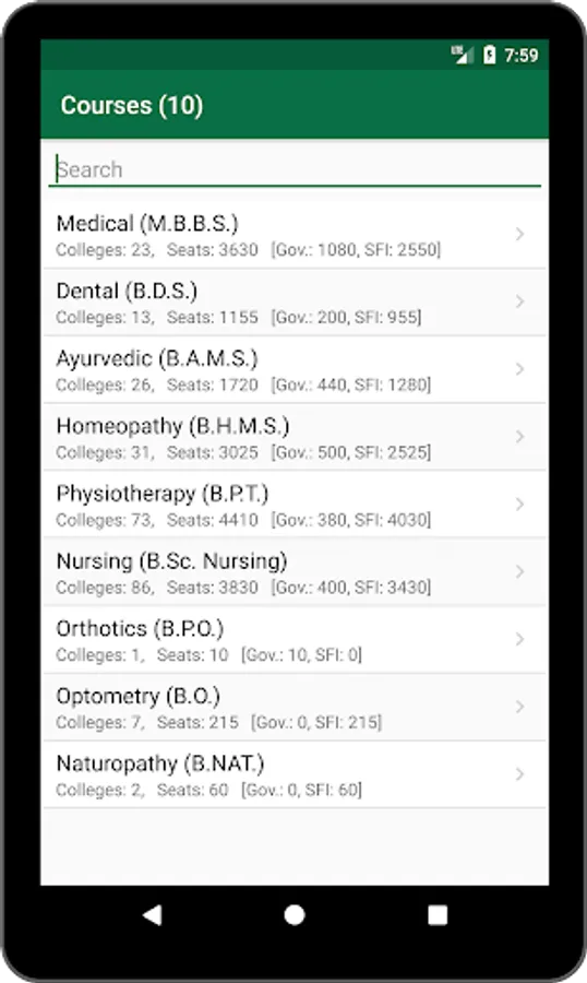 » Courses - The app shows detail data like the total number of colleges, seats available for all the 11 courses.