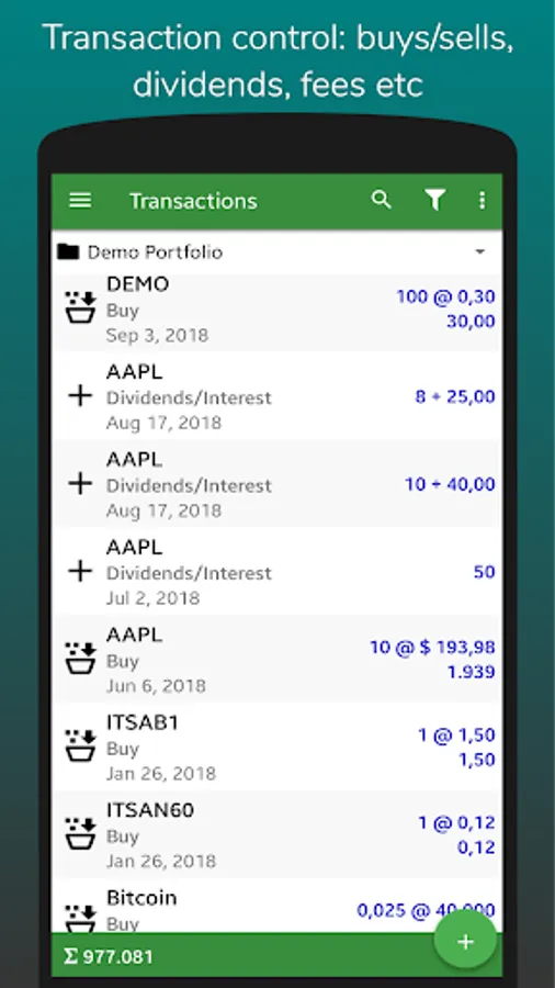 ★ Transactions like buys, sales, transfers, dividends and taxes/fees can be entered manually or imported from CSV files. Recurring transactions like regular deposits and fees can be scheduled.