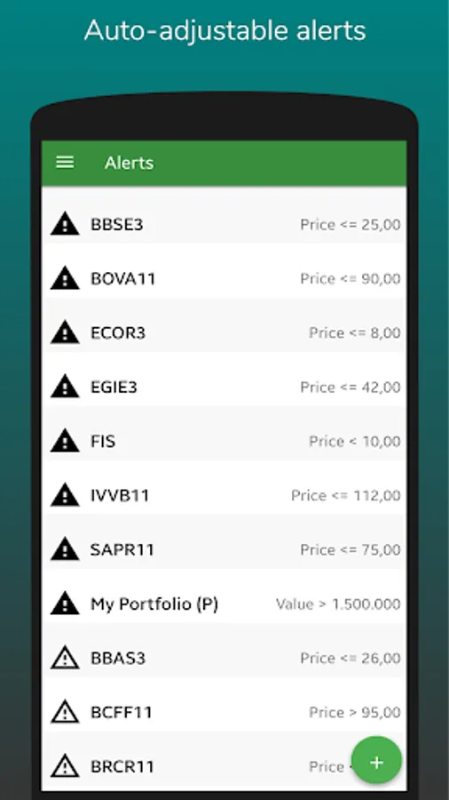 ★ Alerts can be programmed for changes in prices, market value or gain/losses, for each asset or for specific portfolios. After triggered, they can be automatically inverted or adjusted by a certain value or percentage.