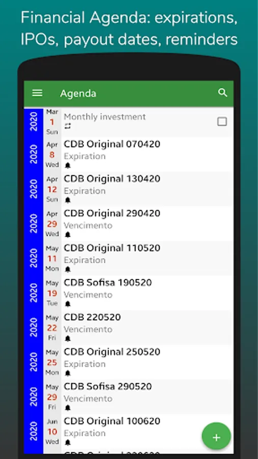 ★ The Financial Agenda keeps track of relevant events and reminders for each asset, like expiration/maturity dates, IPO dates, payout dates etc.