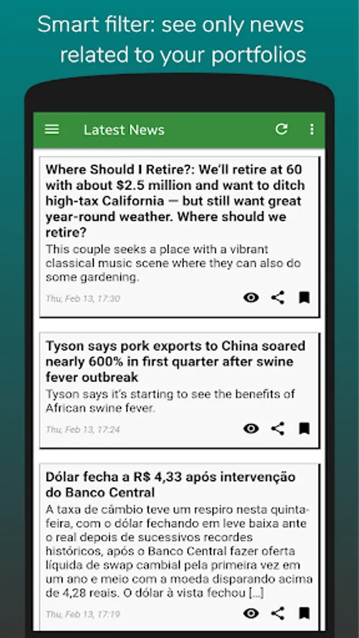 ★ The built-in news aggregator downloads and filters only the news that are relevant to your portfolio. Several channels like CNN and Reuters are provided, and you can easily add more from any RSS feed.