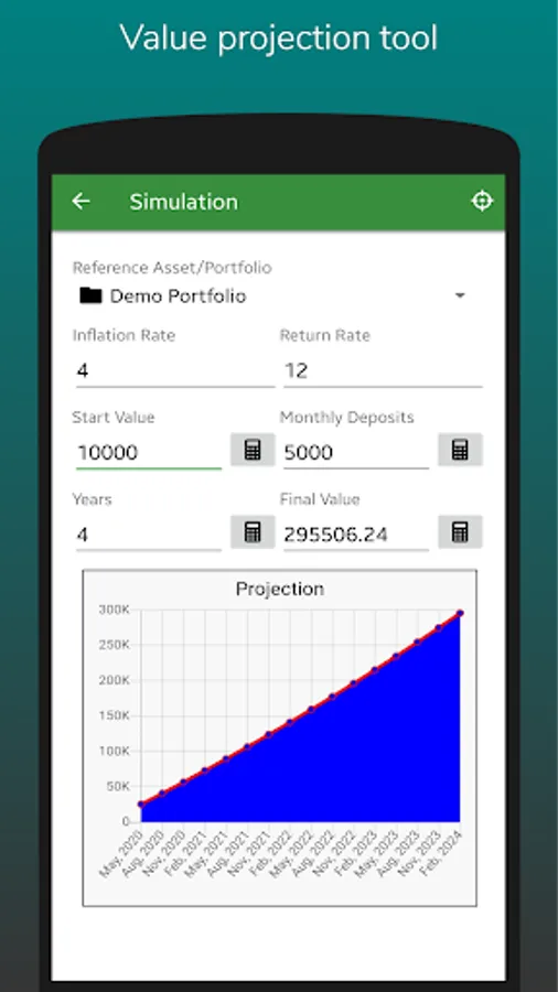 ★ A graphical simulation tool projects the future value of your portfolio based on variables like period, return rate, inflation, monthly deposits etc.