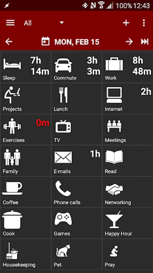 ★ Activities can be grouped in categories like Family, Work, Health etc for better organization and statistics.