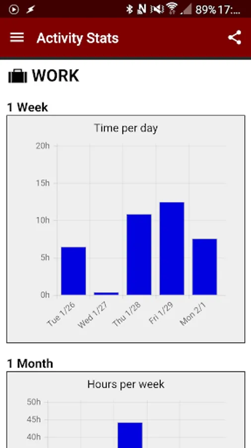 ★ Tasker plugin: allows activities to be started and stopped automatically based on events (ie. start "Work" activity when the phone connects to the company's network, "Commute" when it enters car mode, "Exercises" when you are at the gym etc). Time Balance can also start Tasker tasks when an activity is started/stopped.