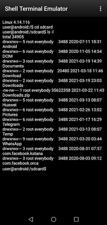 This app is a terminal for Android phones. You can access your Android's built-in Linux command line shell, and use many available commands (Linux/Unix) in your device. It allows you to browse your phone, create or delete files and directories. It's possible to use root options. It has been tested on Gingerbread, Ice Cream Sandwich, Jelly Bean, KitKat, Lollipop, Marshmallow, Nougat, Oreo and Pie.